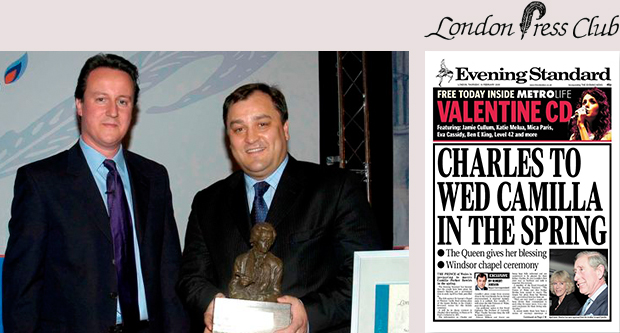 Robert being presented the Scoop of the Year by David Cameron for breaking the story that Charles and Camilla were to wed.